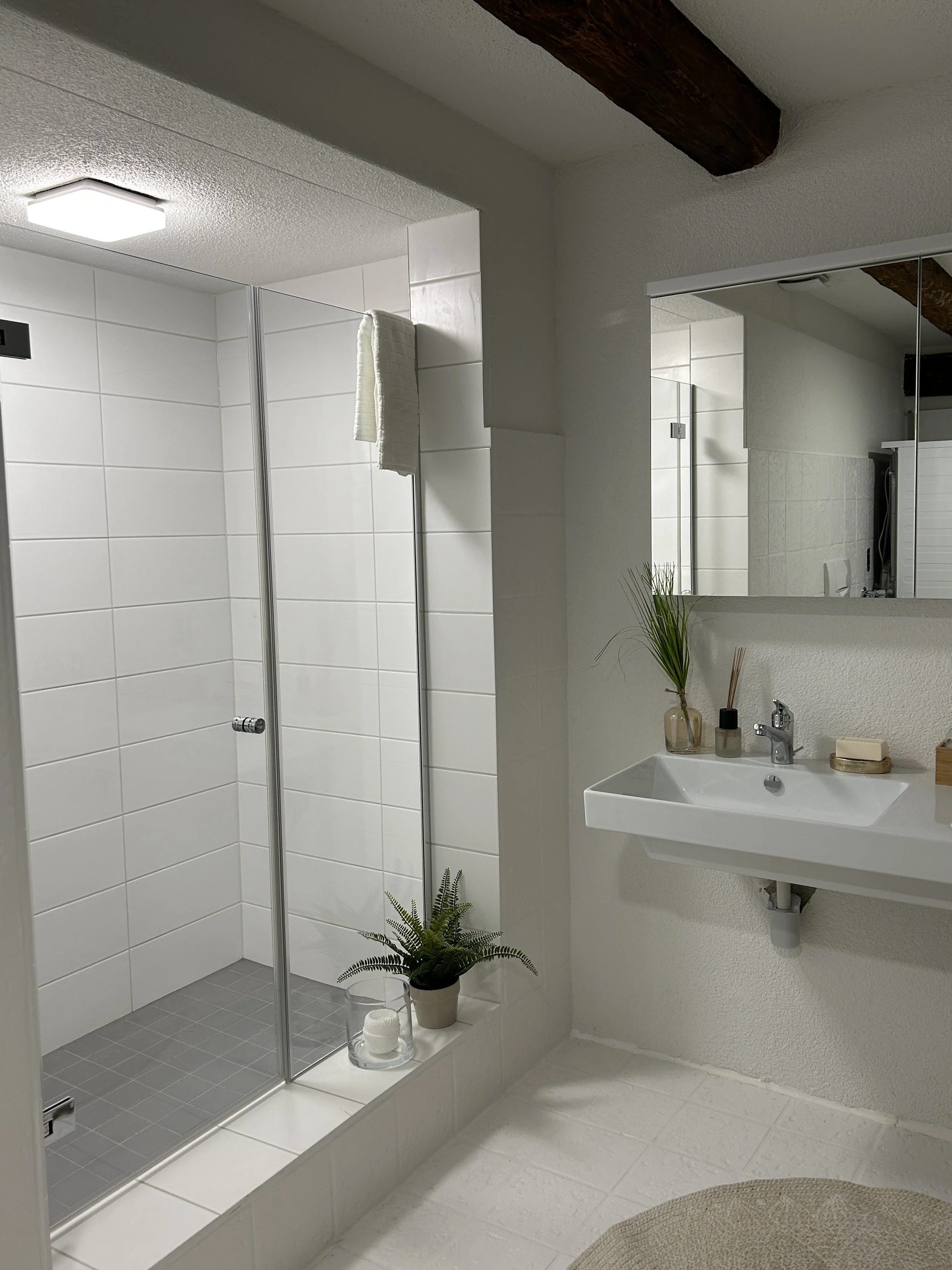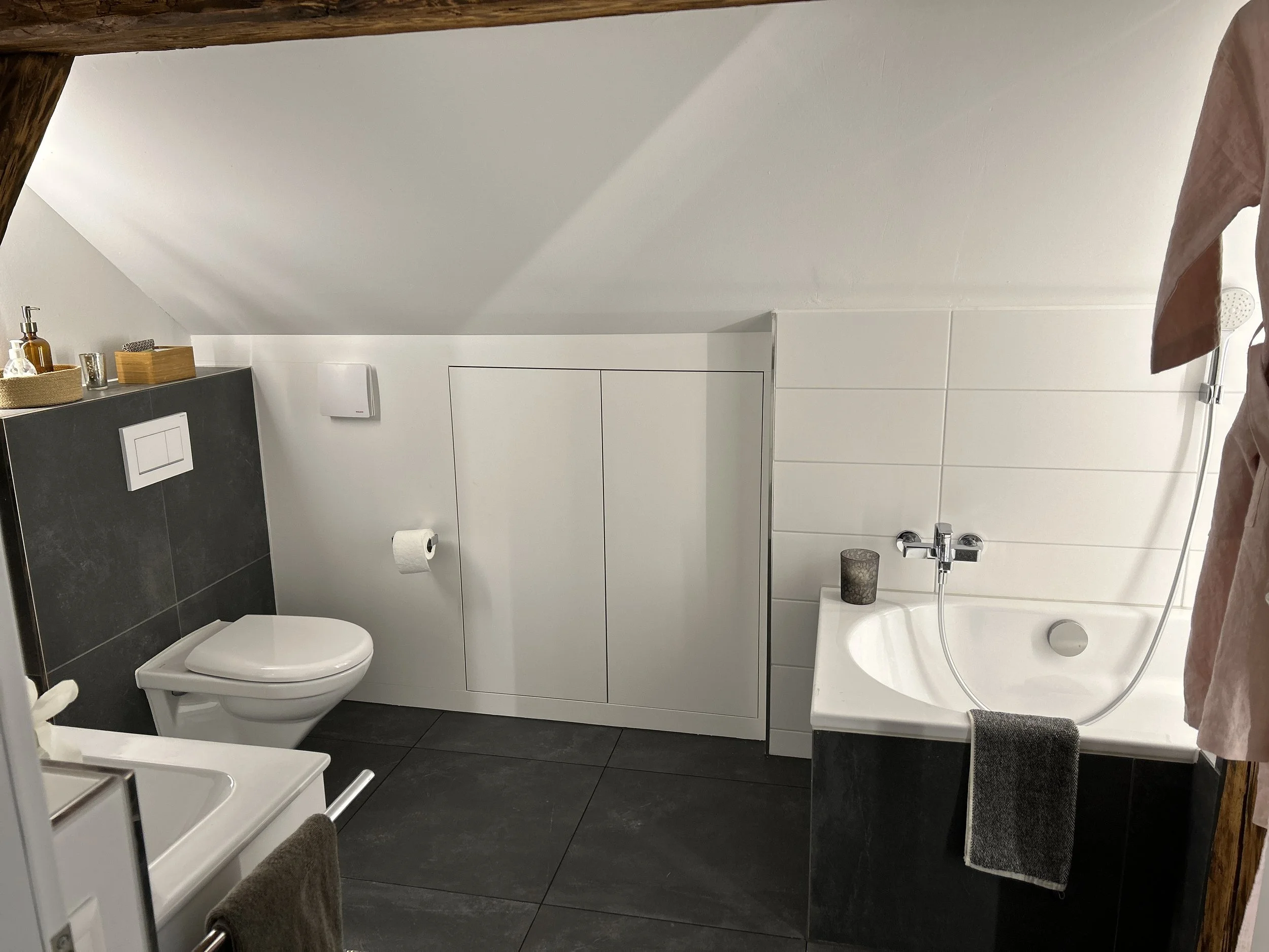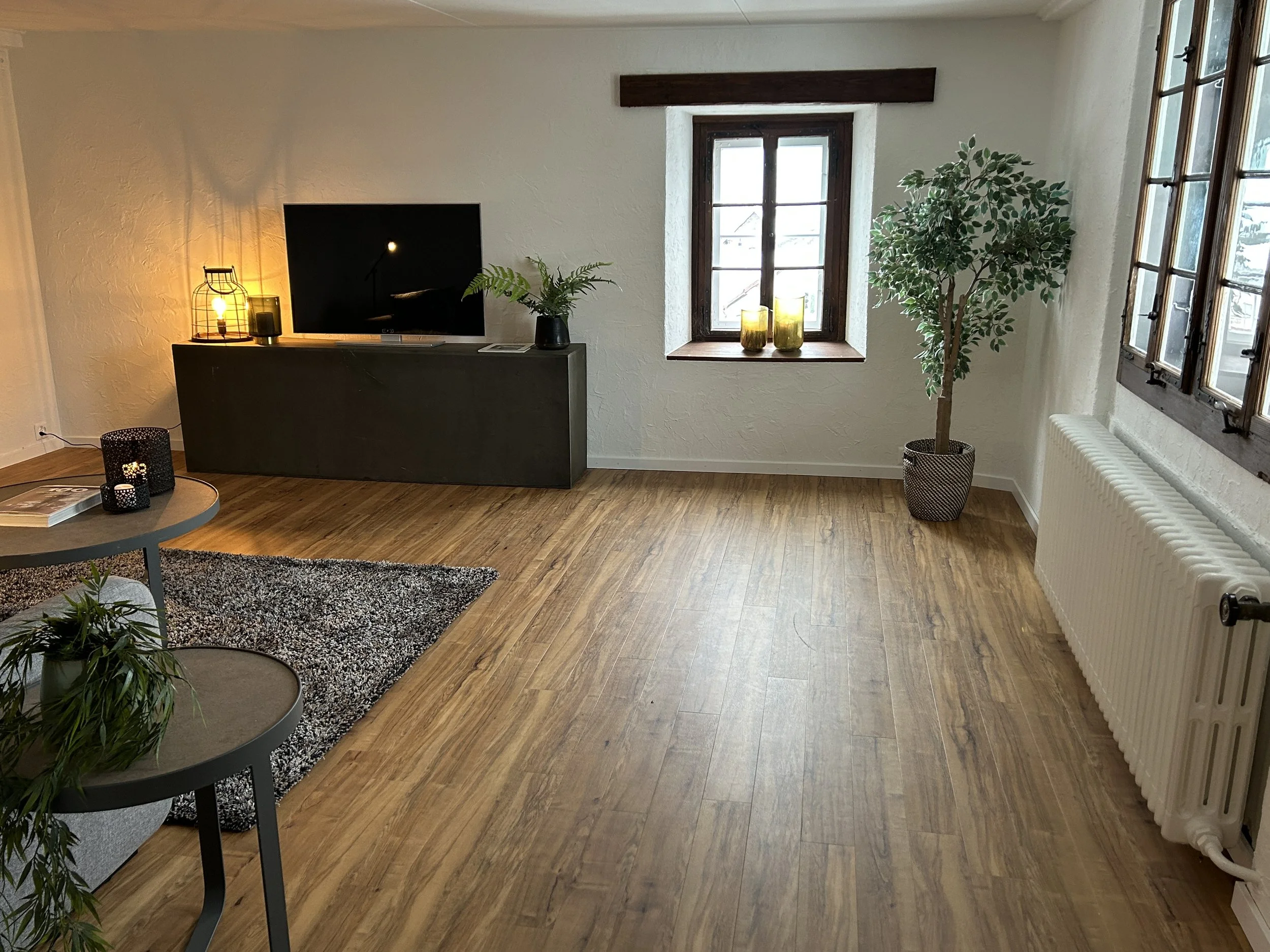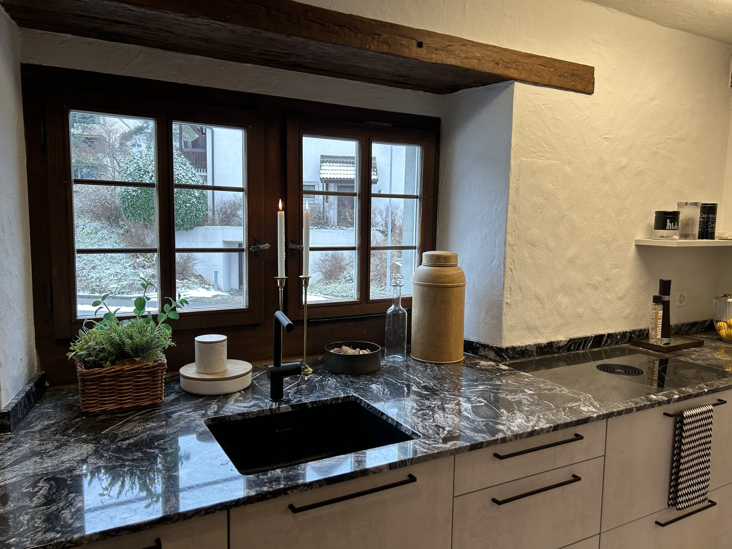Die 3 Zimmer Wohnung mit moderner, neuer Küche, historischem Kachelofen, einem eigenen Gartenbereich, 2 Autoabstellplätzen, grosszügiger Kellerraum ausgestattet.